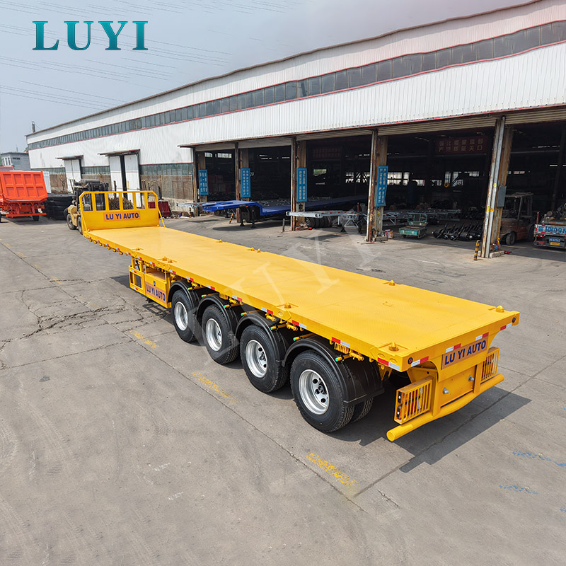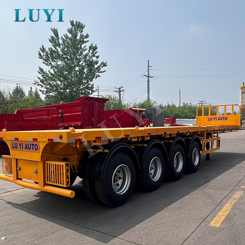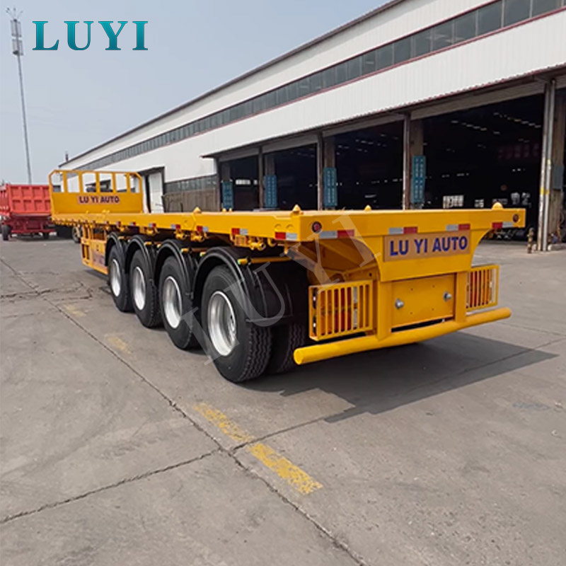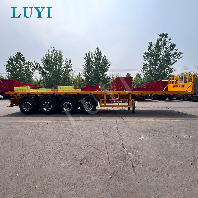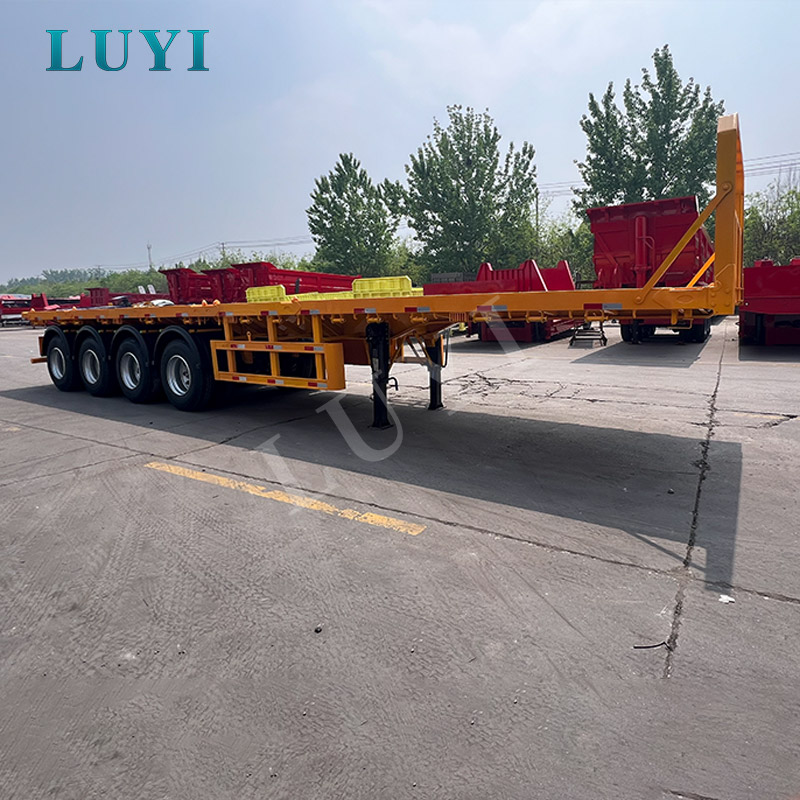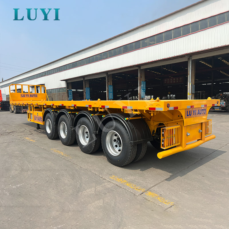 4-axle yellow flatbed semi-trailer transporting container with turnlock flatbed semi-trailer